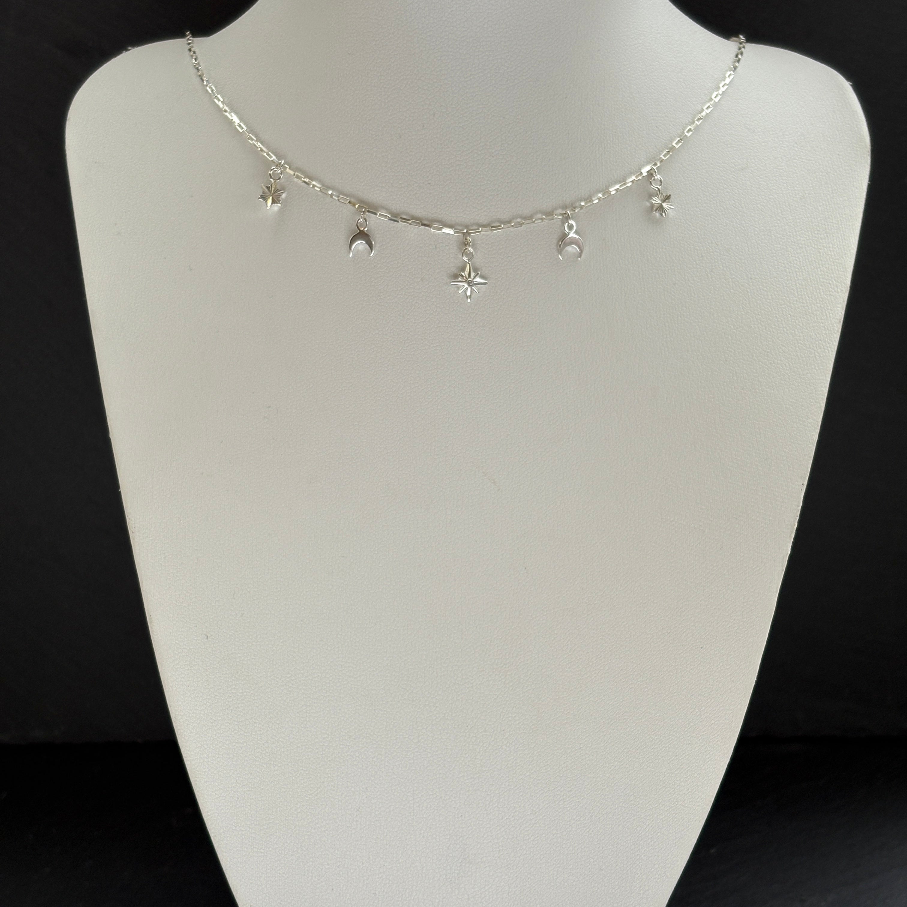 A delicate Sterling Silver Starfall choker necklace. Stunning Silver Moon and Star charms on a delicate 15.5" chain, designed to sit on the collarbone, it's gorgeous to wear alone or layer up with other longer necklaces as a stack.