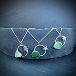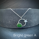 A beautiful Sterling silver Sea Glass pendant necklace. Fusing two ranges, this necklace features a beautifully textured fine silver star, hand-hammered to create a radiant finish that catches the light. The star sits on a signature chunky round link with natural sea glass mounted in Sterling silver and a 1.5mm 18" long curb chain. Part of the Seren collection, each piece is unique.